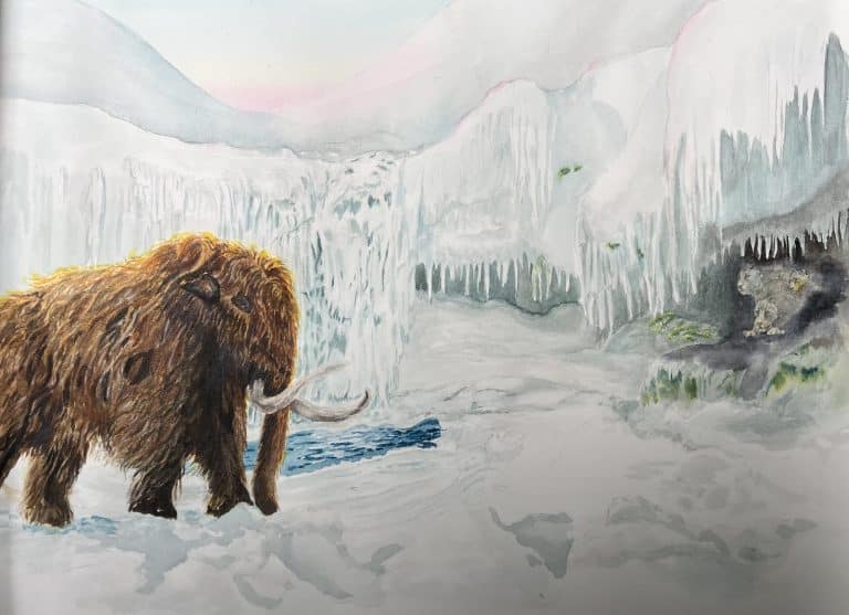 This watercolour shows a matriarchal mammoth finding water and being watched by sheltering cave lions. The scene is based on…