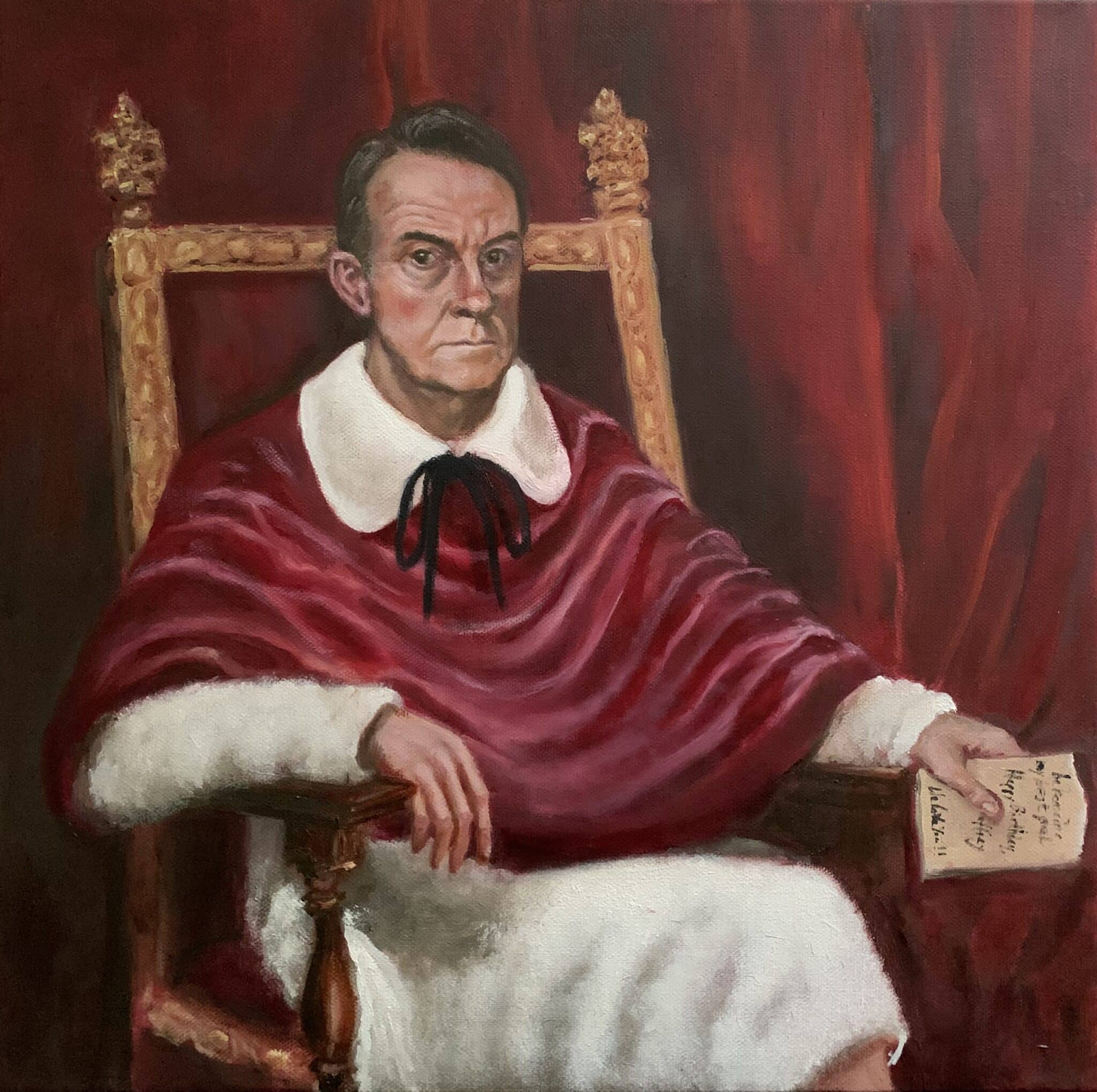 During all his recent media coverage, saw an image of Lord M turned slightly to his left but looking to his right which recalled the pose of Innocent X in his portrait by Diego V; that in turn made me think of seeing Lord M at his Introduction to The House of Lords in a red woollen robe with a white collar. Decided to paint him wearing a hybrid of the Papal satin and Lords’ woollen robes; decided further to deploy a white towelling bathrobe (from a widely utilised news image of the disgraced peer holidaying on Epstein’s island) instead of white linen vestments and, in place of Velazquez’s letter of introduction and recommendation, stuck a mashup of Mandy’s messages to Epstein in his L hand. If parodying this was good enough for Dali, Bacon and others, I’m happy to follow on and, since I was plagiarising anyway, took a Britney Spears song line for a title.