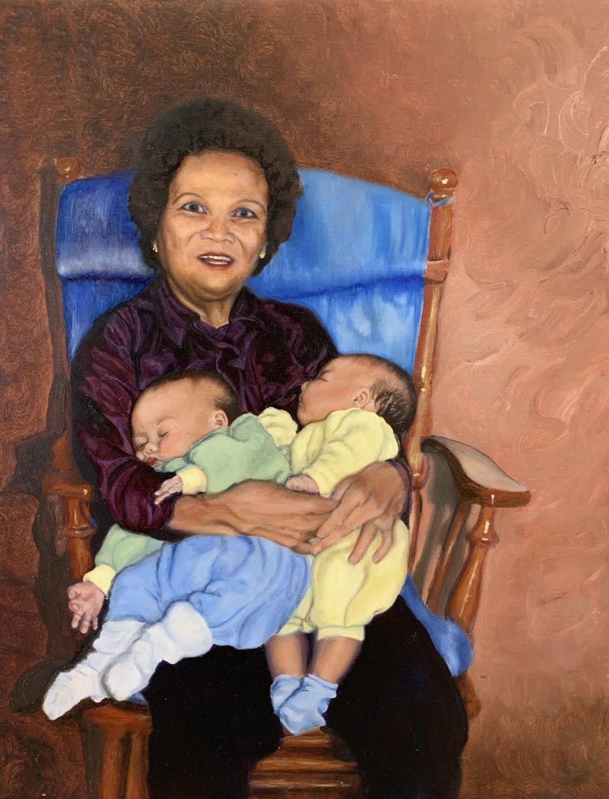 This is a portrait of my mother in law with our twin boys. She loved rocking the babies to sleep and was very happy to have grandsons to pass on the Wong name, so important to her generation! It was a joy to paint these loved ones.