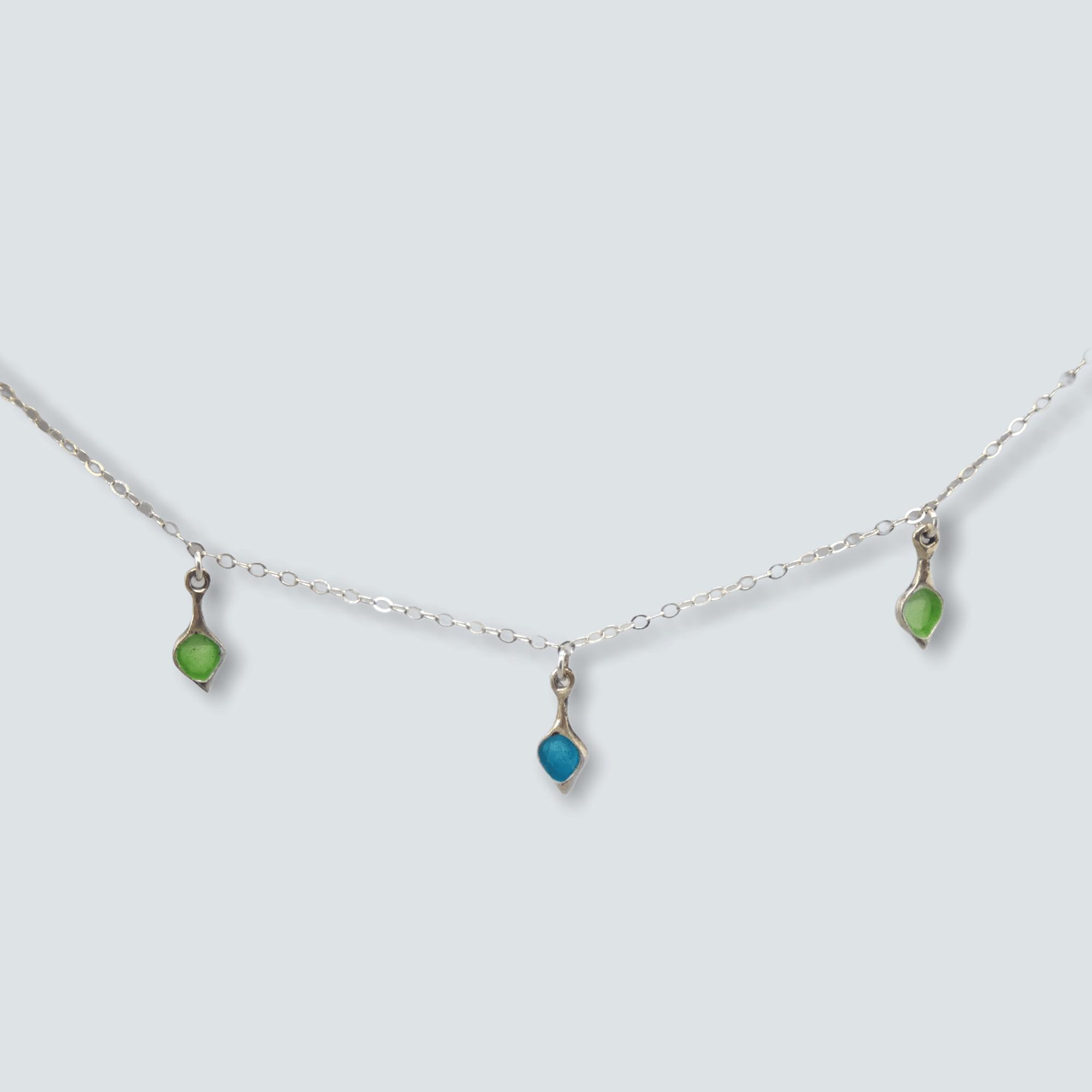 Petals cast in Silver with plique à jour enamels in turquoise and spring green, suspended from a Silver chain.