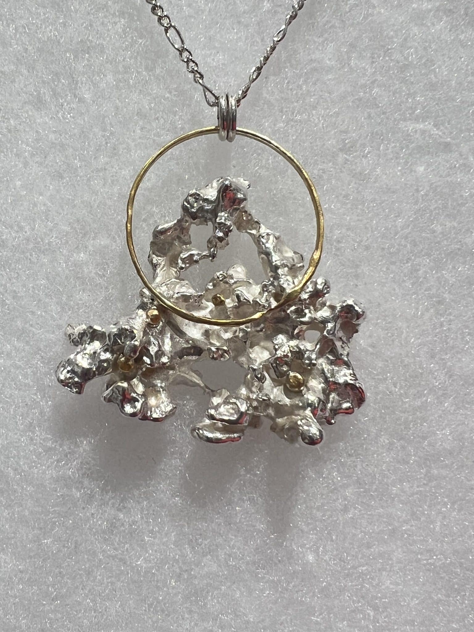 West coast Sea Salt cast sterling silver landscape framed in a 24 carat gold plated circle depicting solar or lunar reflections.
