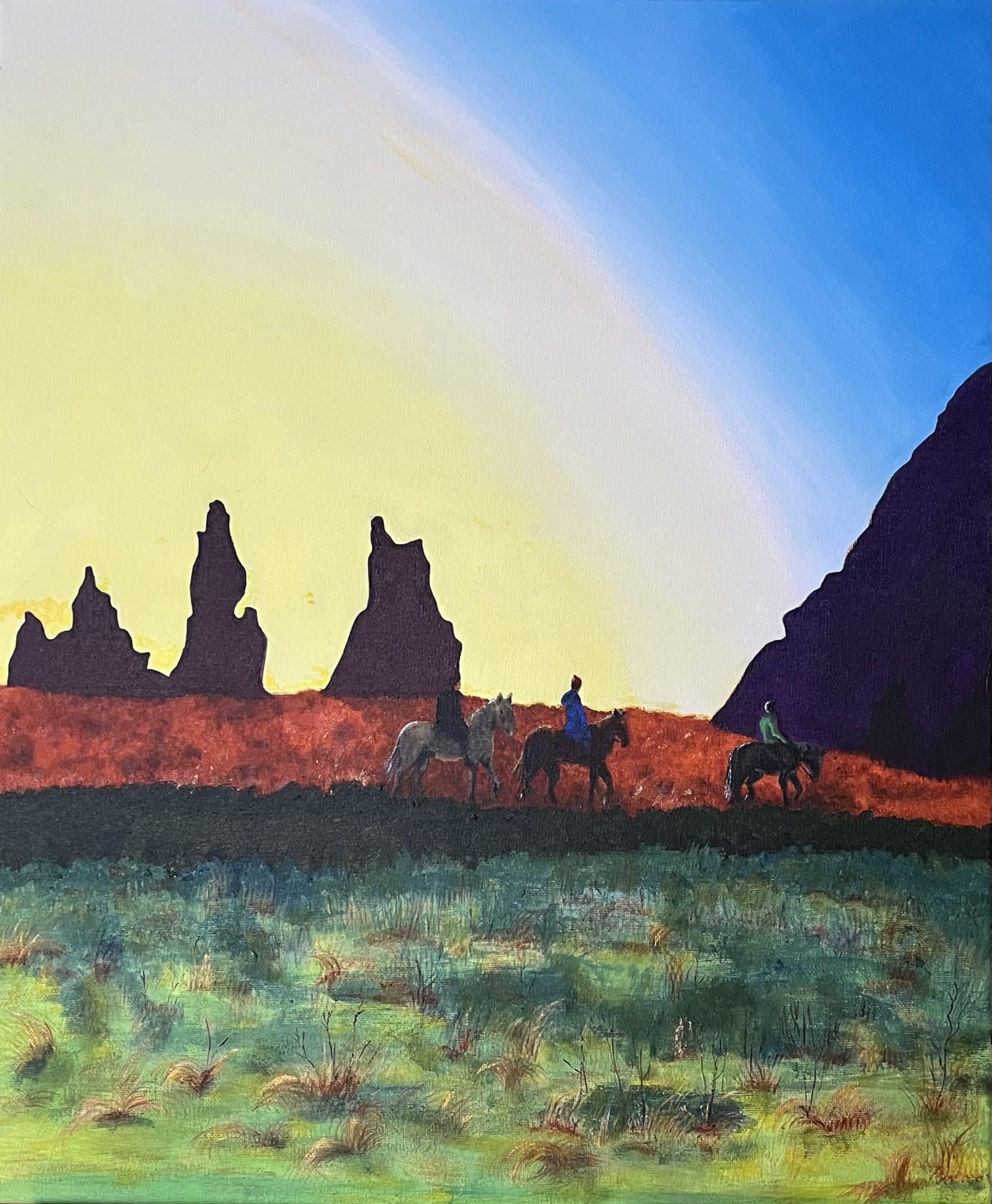 This landscape is based on a photo taken on our recent trip to Iceland. I was so excited to see these famous sea stacks. It was a lovely composition with the three riders mimicking the stacks. All were silhouetted against the November afternoon sky. I have exaggerated the colours to give the feeling of joy.