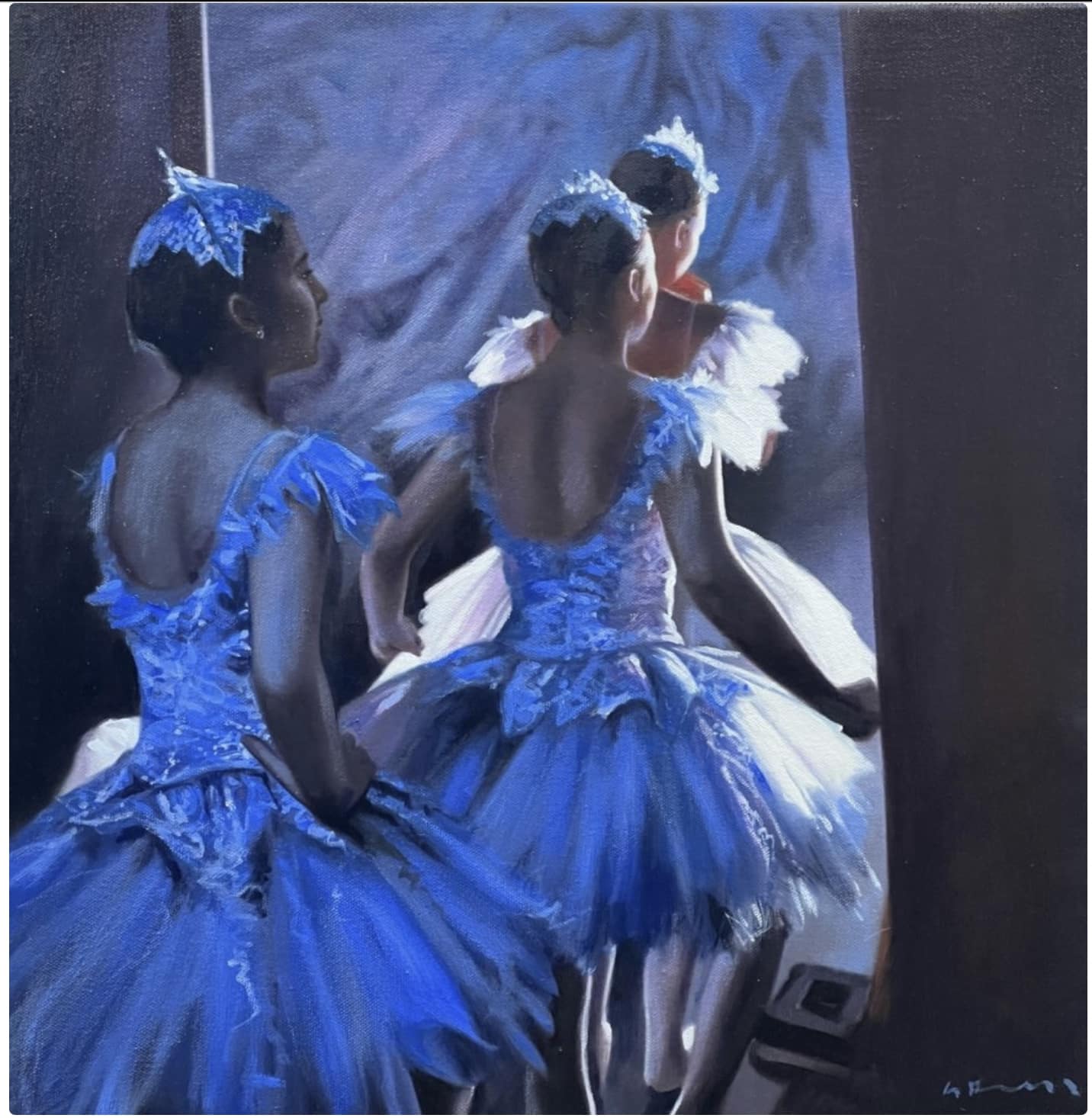 One of my paintings in the Ballet series. This particular painting based on a Ballet called the snow queen when I was given access to go backstage. It focuses like many of these paintings on the moment before the performance